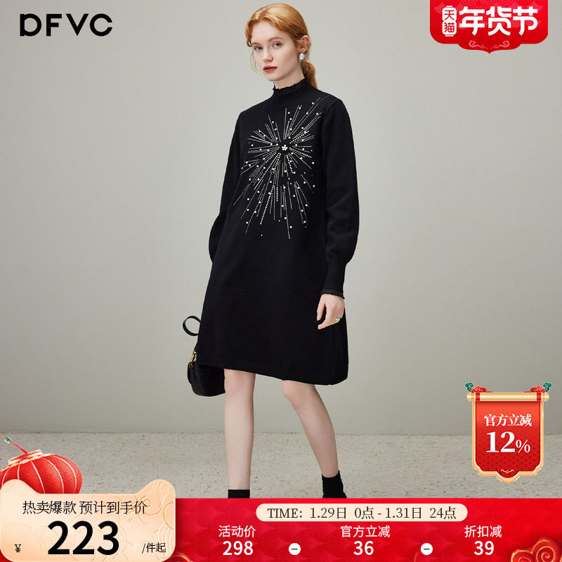 dfvc黑色重工钉珠针织连衣裙女2025年冬季新款半高领毛衣裙打底裙