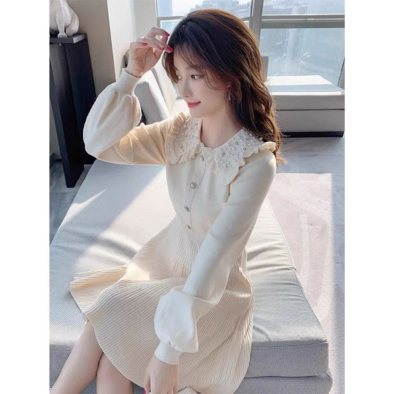 法式钉珠针织连衣裙女秋冬高级感宽松遮肚子显瘦拼接打底裙百褶裙