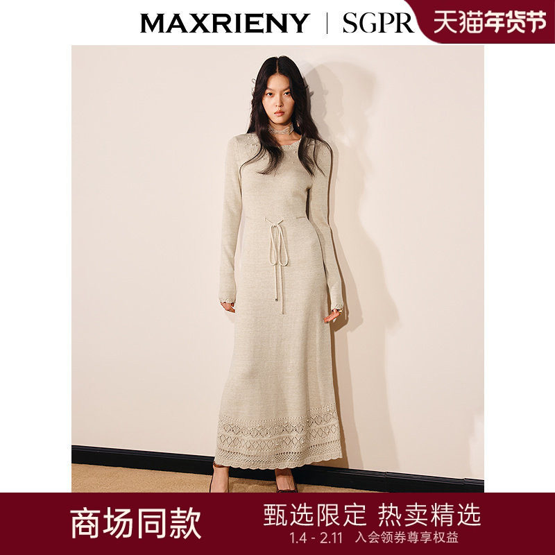 【SGPR】钉珠收腰毛织波嬉风连衣裙2026春季新款修身针织长裙