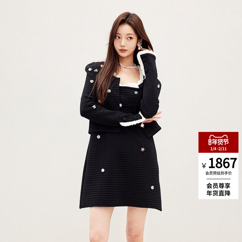 【明星同款】lefame拉飞姆2026春季黑色花朵钉珠针织连衣裙