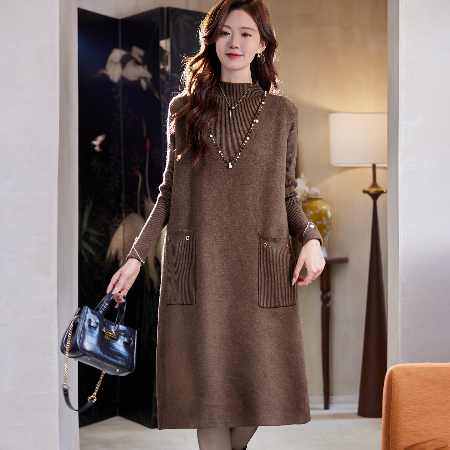 茗思时尚钉珠针织连衣裙女2026春季新款法式长袖半高领显瘦毛衣裙