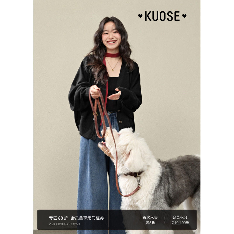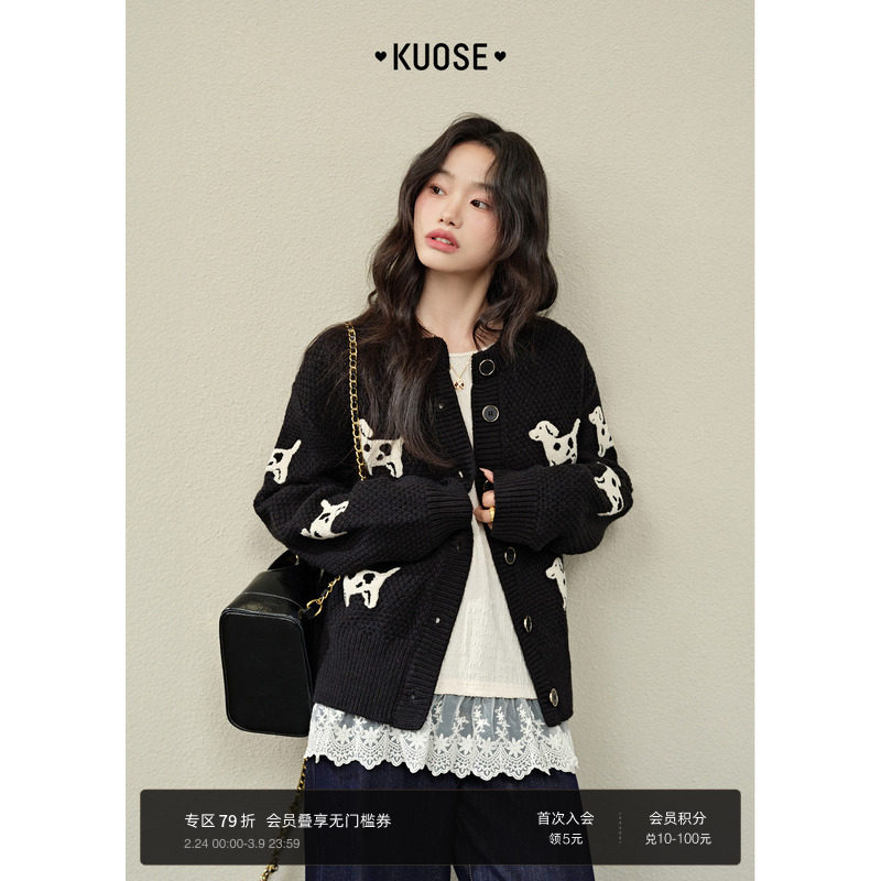 阔色黑色小狗针织衫开衫女25秋冬季新款慵懒毛衣短外套长袖上衣春