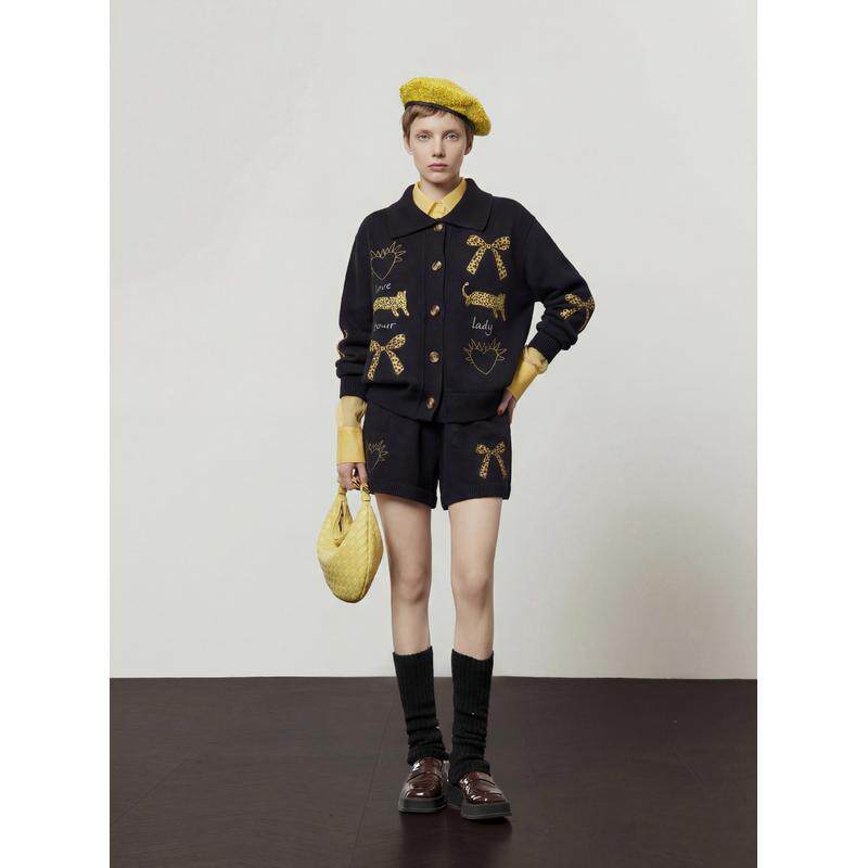 阔色刺绣小狗针织开衫外套上衣黑色女2026春季新款小个子毛衣秋冬