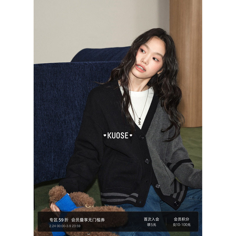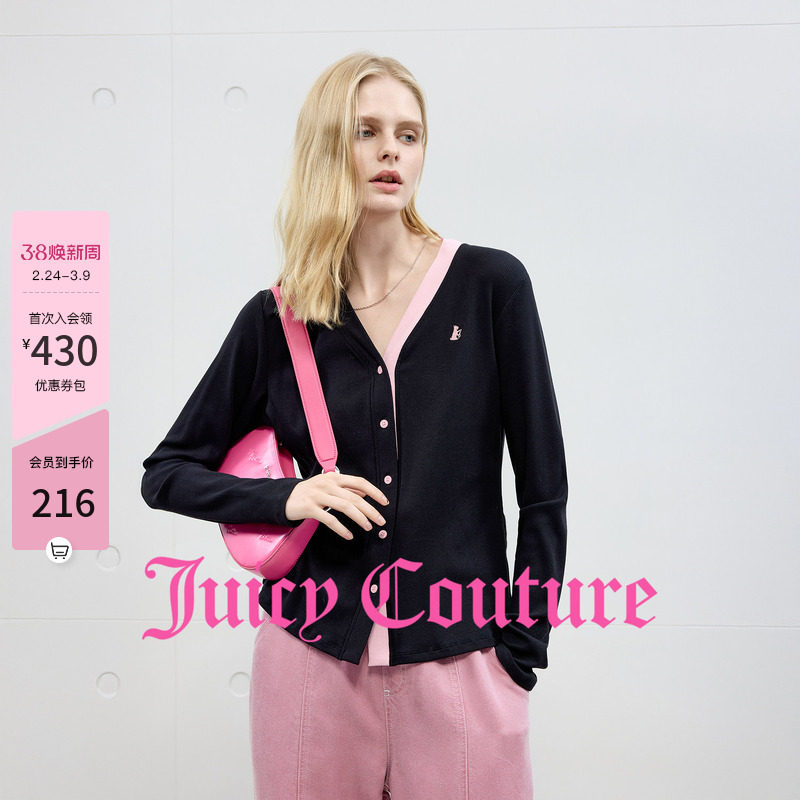 Juicy Couture橘滋针织衫女撞色拼接V领黑色开衫气质毛衣上衣