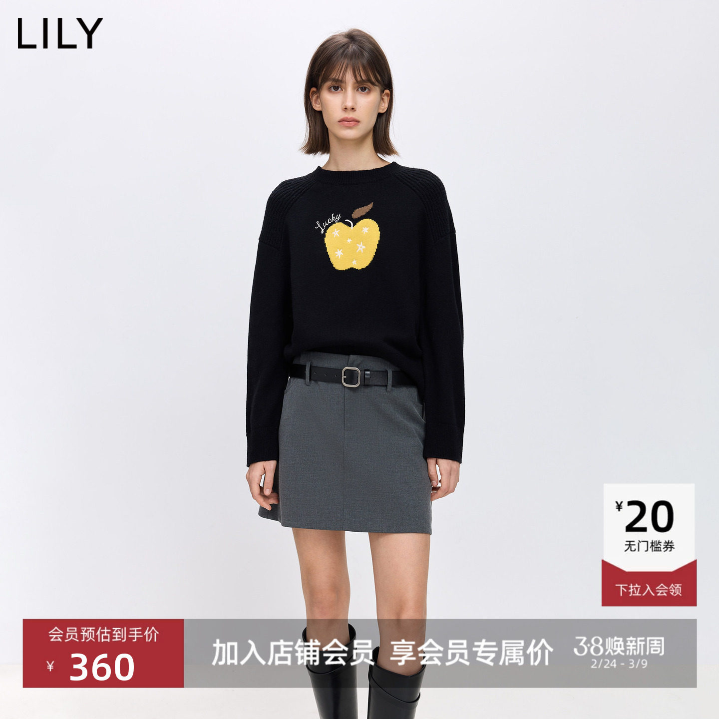 LILY2026春新款羊毛混纺刺绣撞色上衣黑色针织衫套头毛衣外套女