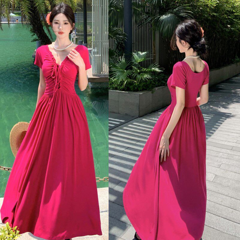 三亚旅游穿搭度假多巴胺玫红色吊带连衣裙超美海边拍照沙滩长裙女