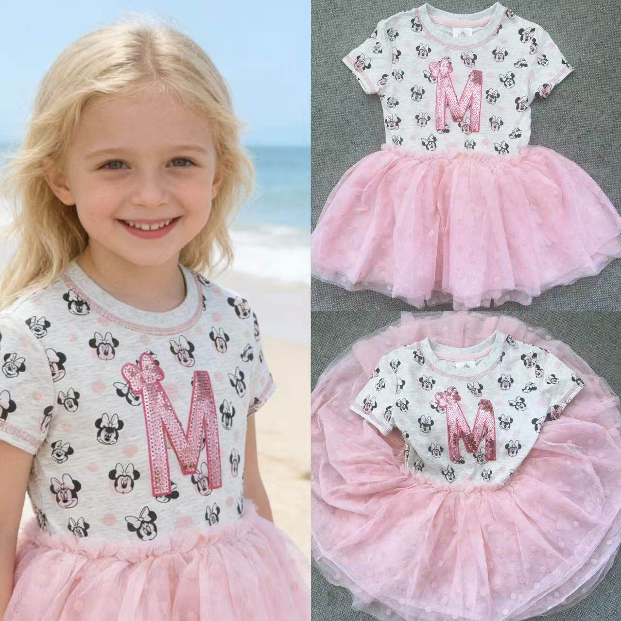 超美外单春夏女童2-12岁卡通米妮亮片网纱拼接蓬蓬公主连衣裙裙子