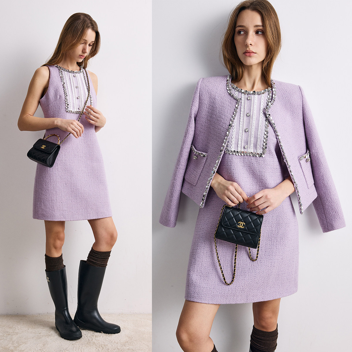 【莫奈紫!】原C面料粗花呢套装 超美手缝钻外套+半裙+连衣裙