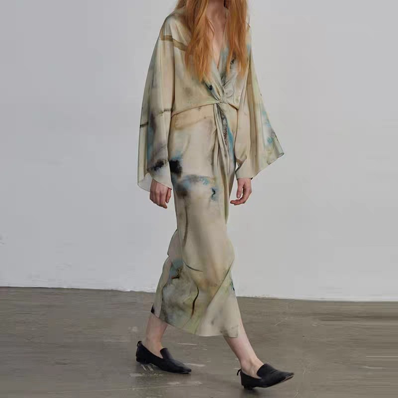 亏qing超美推荐水墨晕染扭结真丝长裙高级感新中式国风花色连衣裙