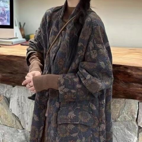 国风厚款秋冬新款优雅蓝花夹棉棉服新中式长款棉衣文艺复古风衣女