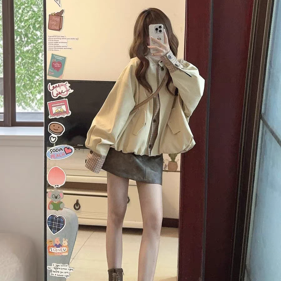 LUU桃喜儿/两穿短款格子风衣外套女秋冬宽松设计感小众韩版上衣
