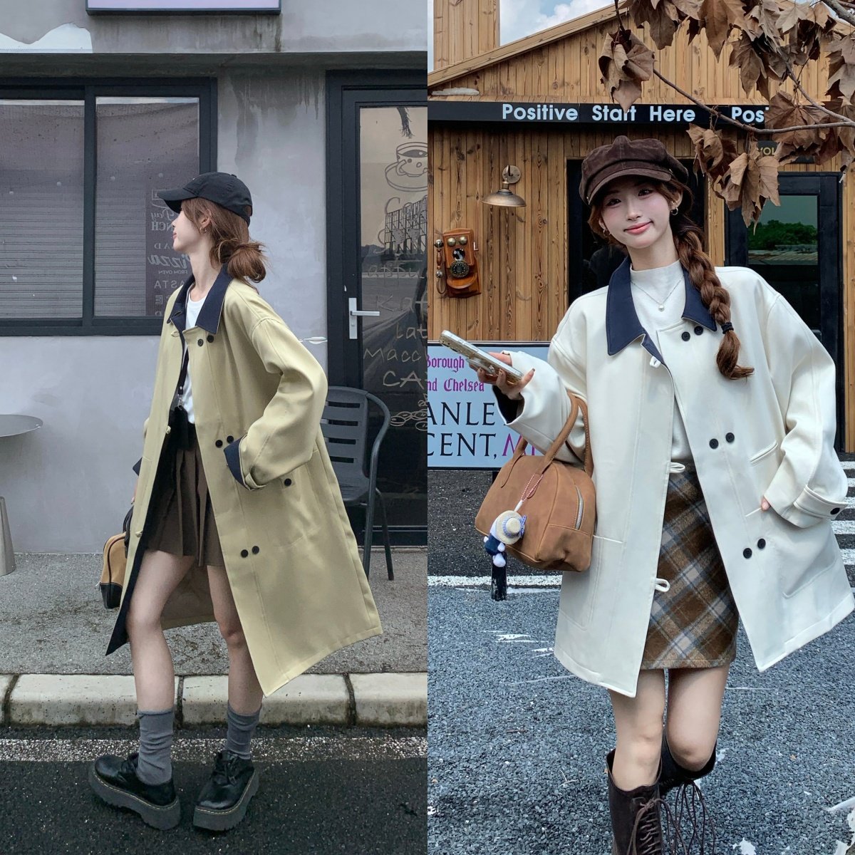 大码秋冬撞色翻领工装风衣韩系复古气质中长款外套长短款加棉加厚