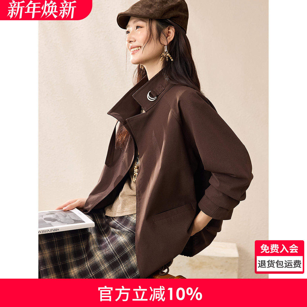 沫晗依美都市女人风衣2025秋季新款斜扣设计感立领插肩袖短款外套