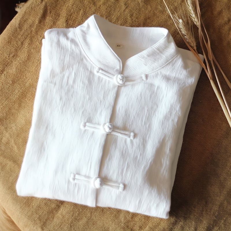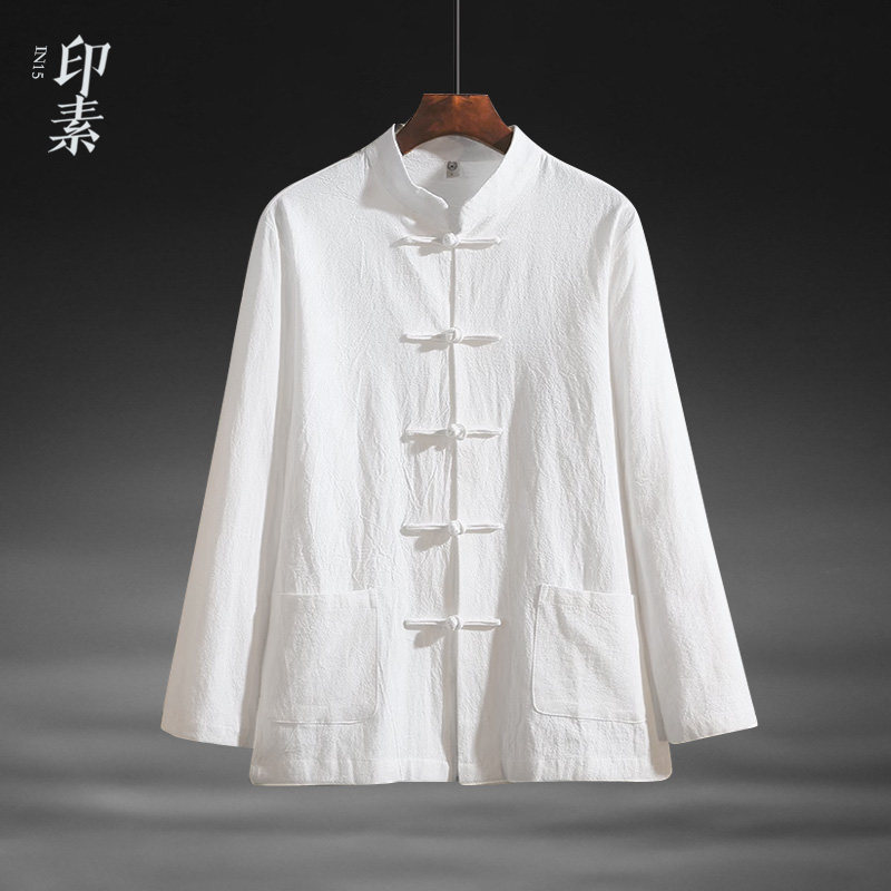 中国风秋季男复古中式立领盘扣亚麻长袖白色衬衫唐装棉麻宽松汉服