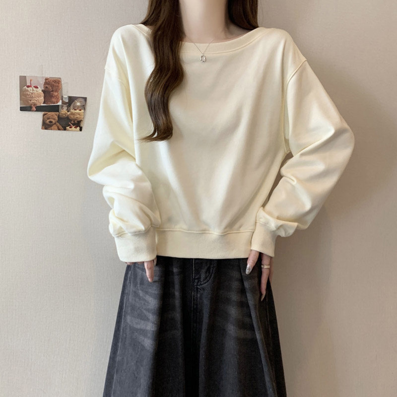 纯色简约风一字领长袖卫衣女秋装百搭韩版宽松短款小个子薄款上衣