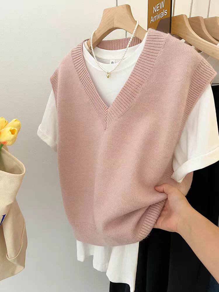韩版宽松短款粉色V领羊绒马甲女针织春秋冬外穿无袖毛衣背心坎肩