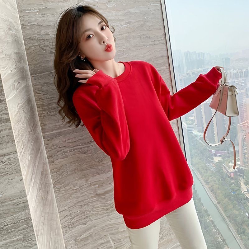 新疆棉320g纯白色卫衣女2026款韩版宽松大红色圆领重磅华棉套头上
