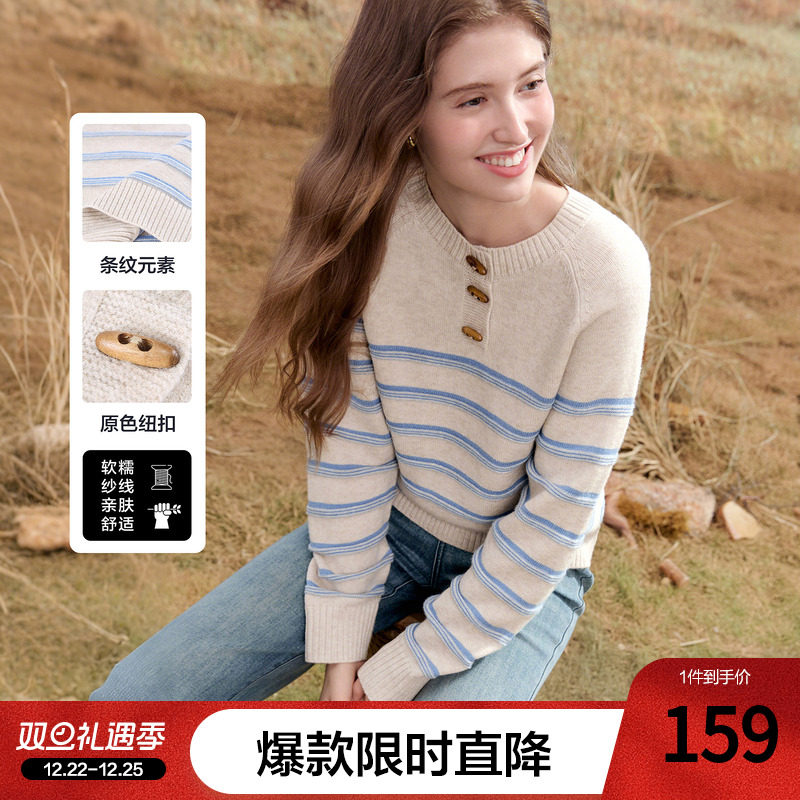 betu百图经典撞色条纹针织衫女套头2025年秋季新款牛角扣毛线衣