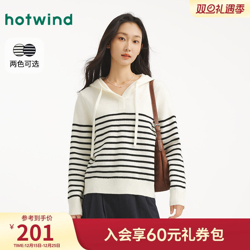 热风女士针织衫毛衣2025年秋季新款连帽套头条纹宽松针织衫打底衫