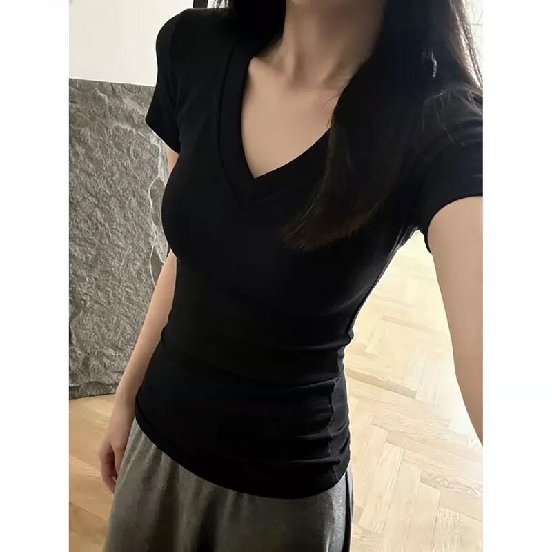 2026夏季新款纯色黑色短袖T恤女修身显瘦纯棉辣妹百搭v领正肩上衣