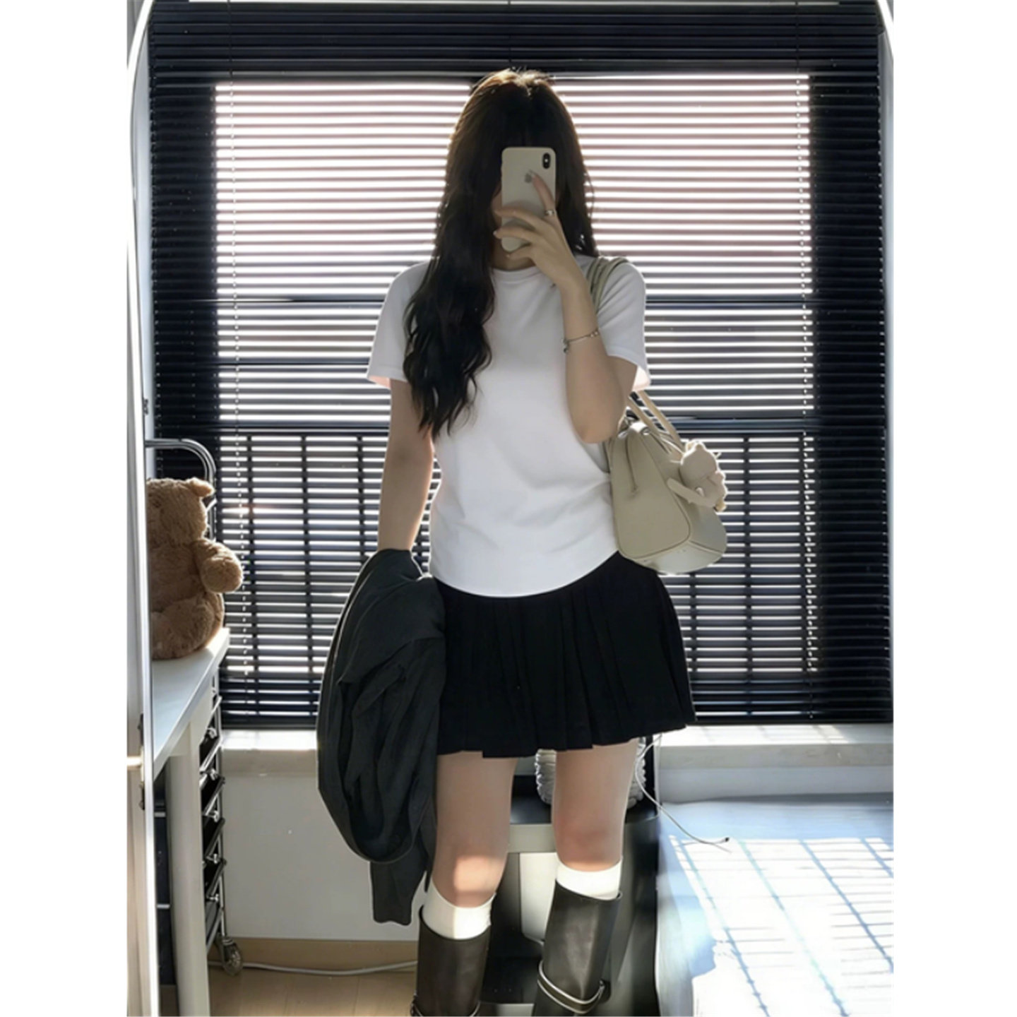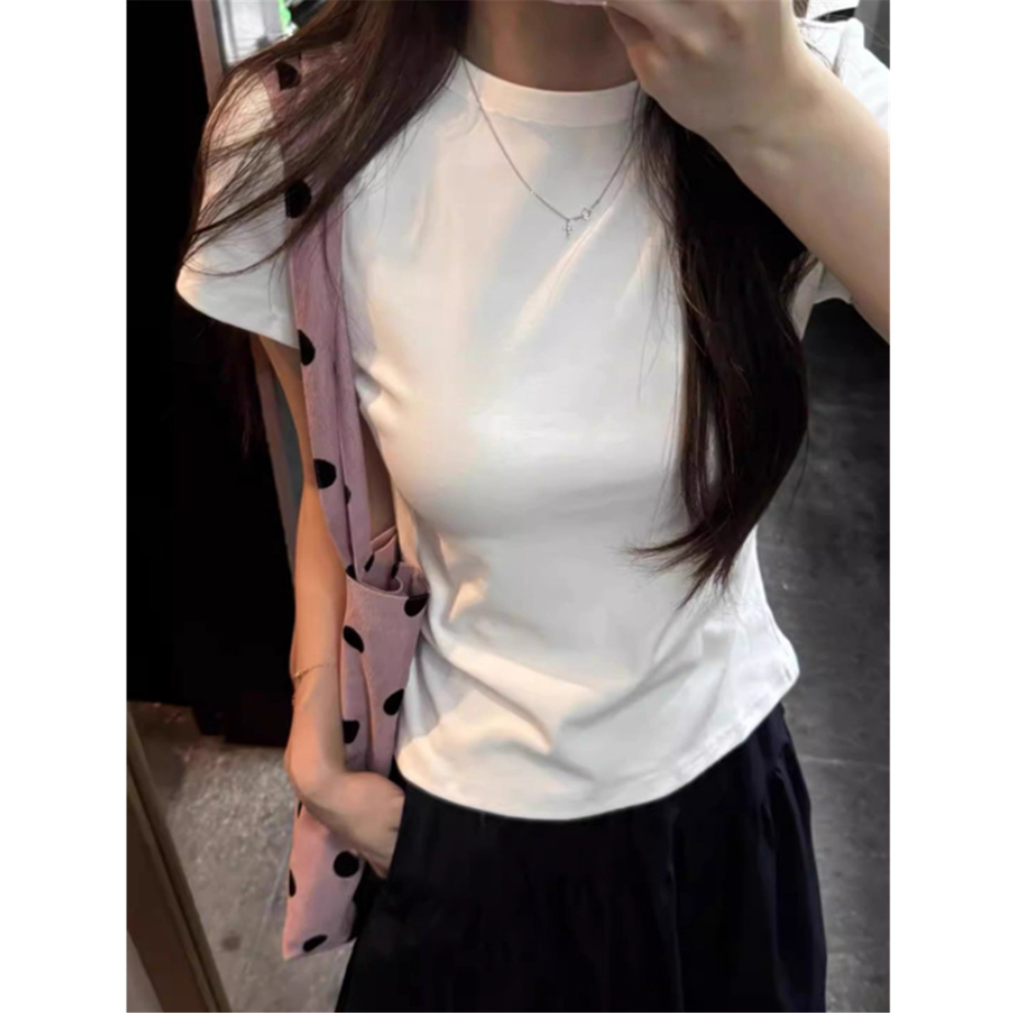 美式纯棉正肩圆领白色短袖T恤女夏季基础款纯色修身短款收腰上衣