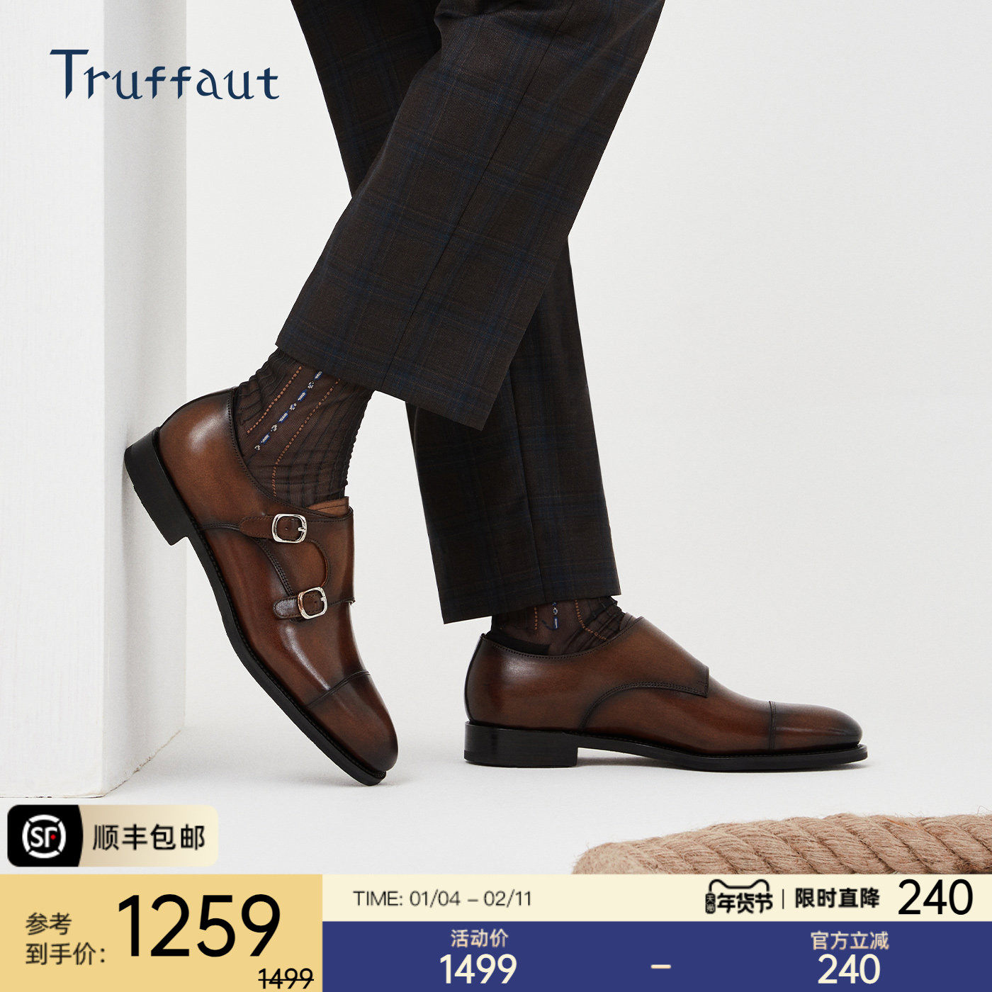 Truffaut手工擦色固特异男鞋真皮皮鞋男款商务复古搭扣孟克鞋冬季