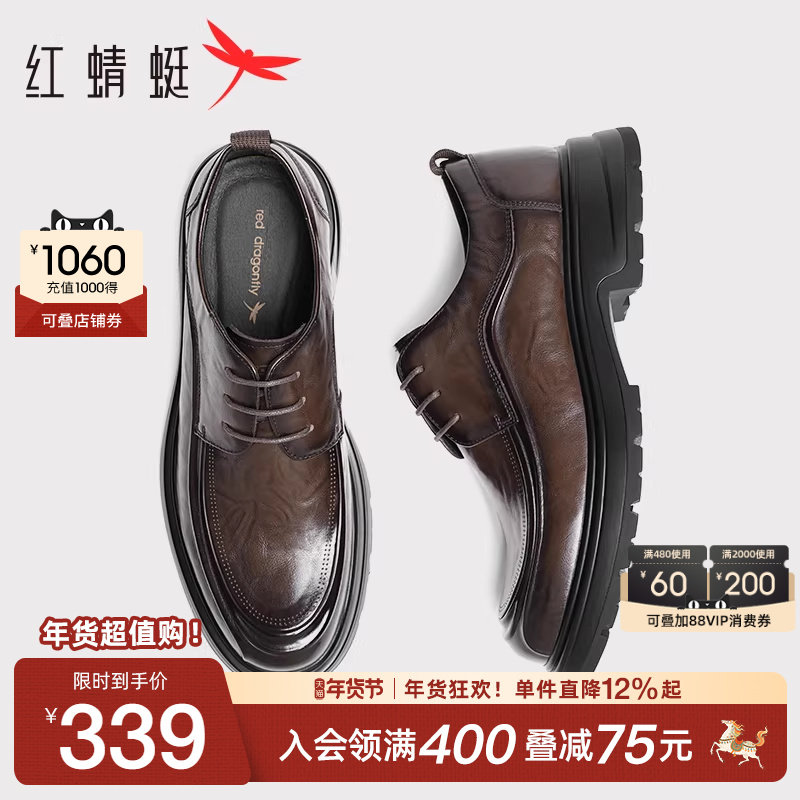 红蜻蜓男鞋秋冬新款商务皮鞋褶皱厚底青年真皮皮鞋男士增高休闲鞋