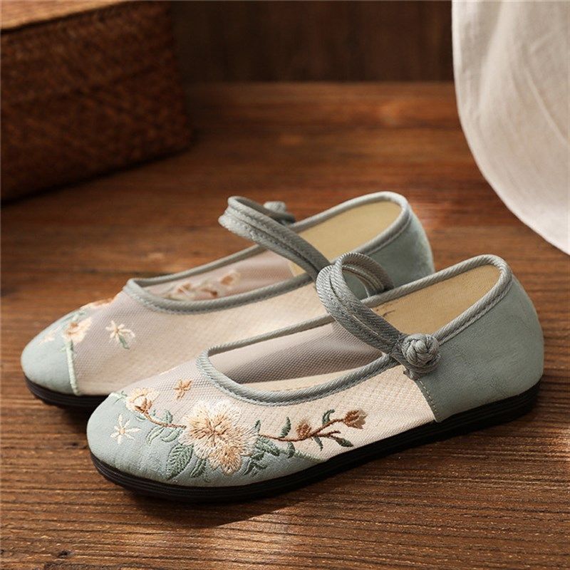 夏季女鞋平底古风网纱凉鞋v淡雅绣花鞋古装鞋子汉服民族风透气布
