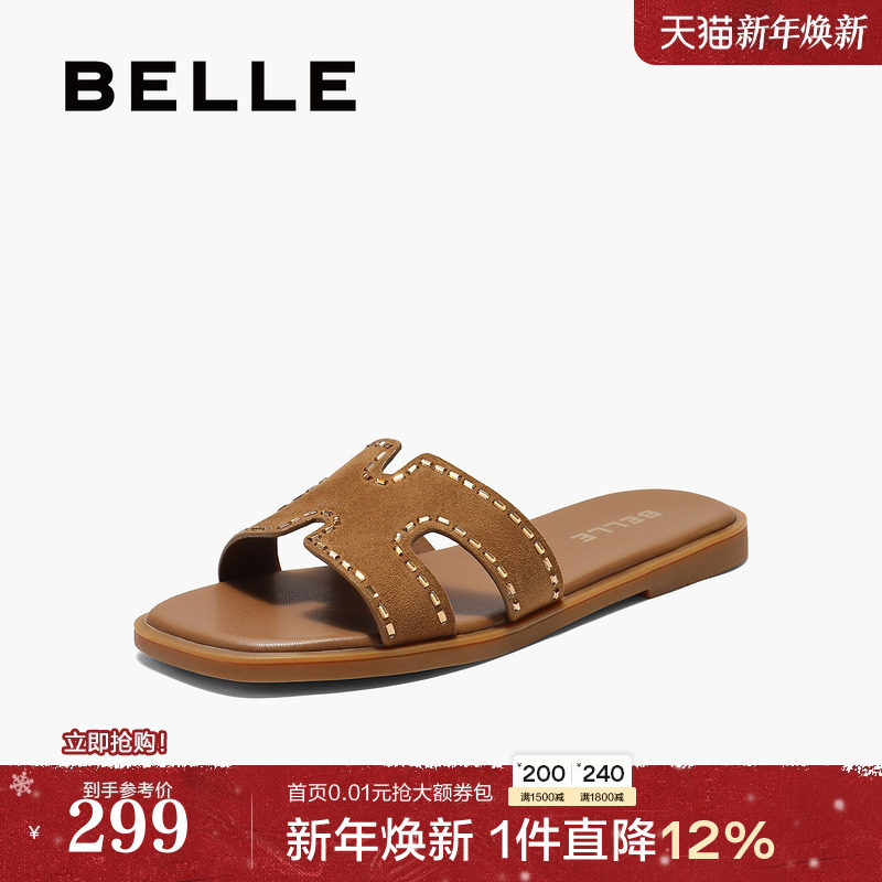 百丽女鞋子平底一字拖2025夏季新款真皮沙滩可外穿拖鞋B2612BT5