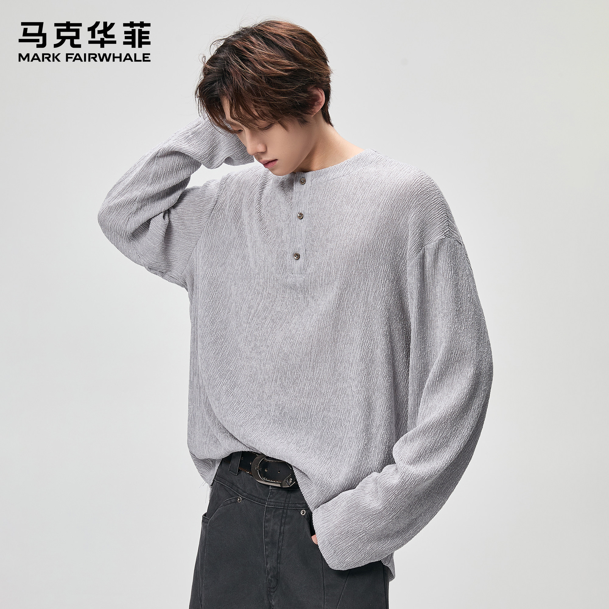 马克华菲长袖t恤男新款潮牌美式复古肌理感重磅亨利领宽松体恤衫