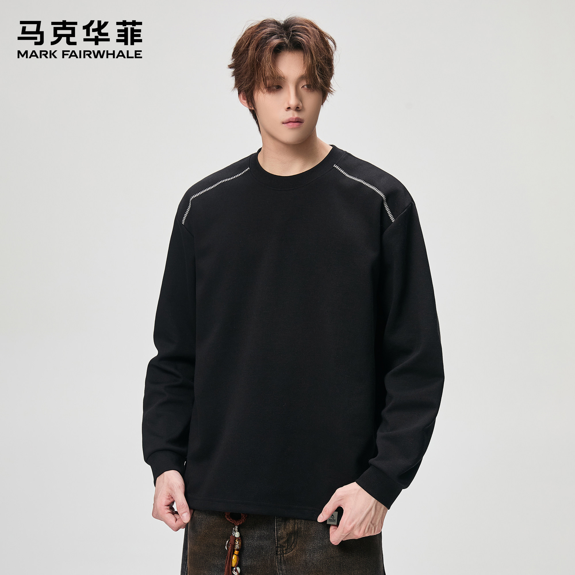 马克华菲长袖t恤男秋季新款潮牌美式圆领宽松百搭纯色宽松打底衫