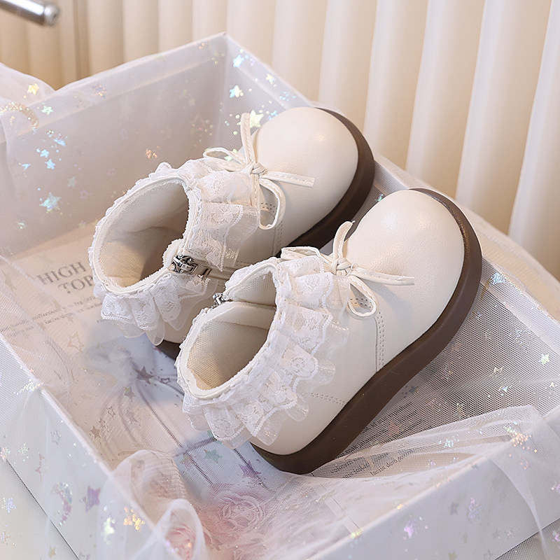 真皮女童靴子冬季儿童马丁靴女孩蕾丝边公主短靴加绒宝宝保暖皮靴