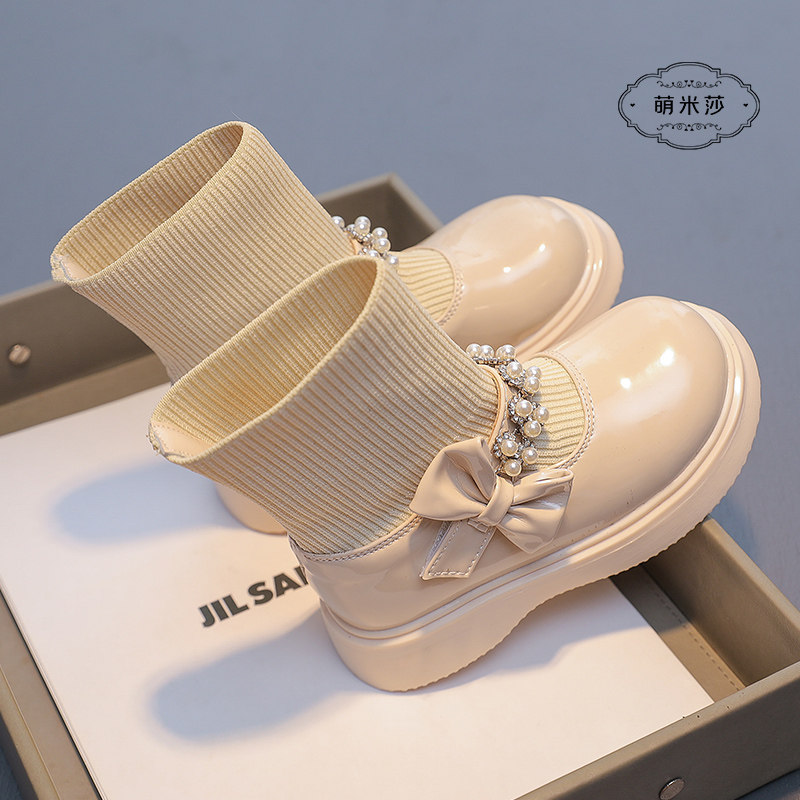 真皮儿童马丁靴女童毛线筒短靴2025秋冬新款女宝宝珍珠加绒袜子靴