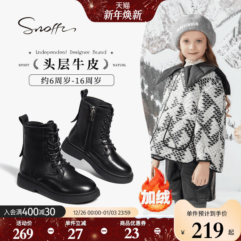 斯纳菲儿童马丁靴女童皮靴真皮2025冬新款女孩靴子小公主加厚棉靴