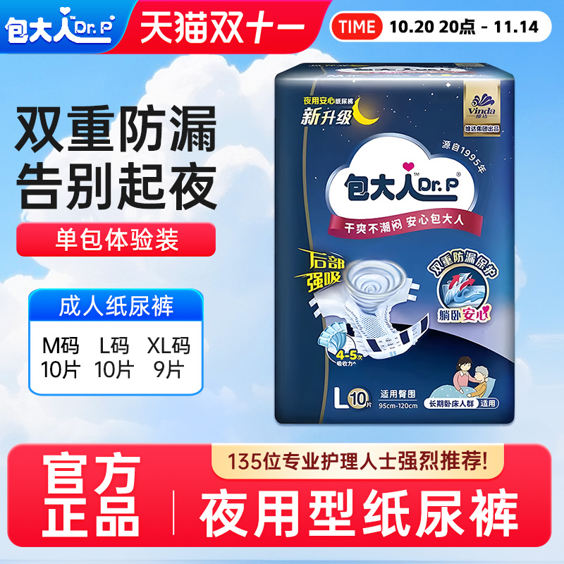 包大人夜用老人纸尿裤M/L/XL码加厚型成年人纸尿裤尿不湿防漏单包