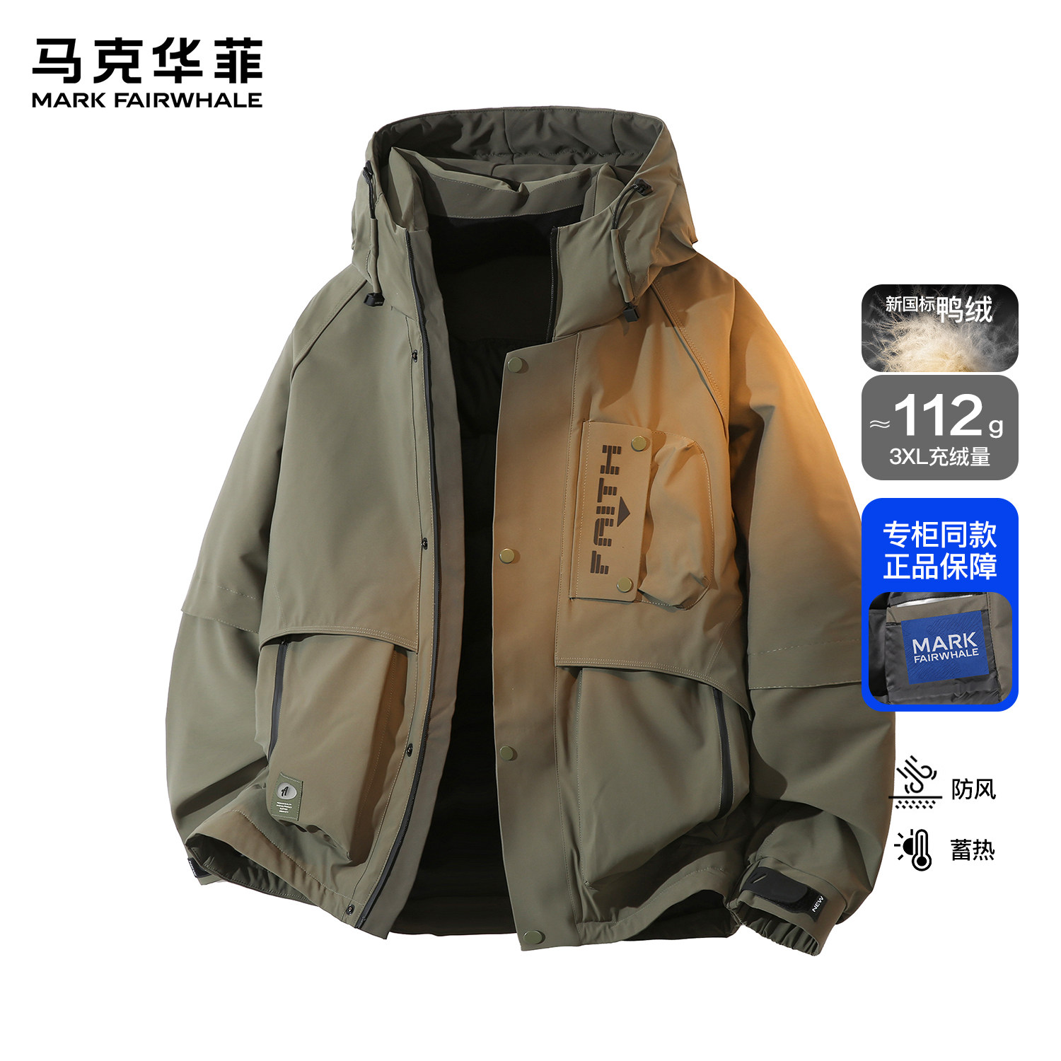 马克华菲冬季户外三防连帽工装羽绒服男潮牌白鸭绒保暖宽松冲锋衣