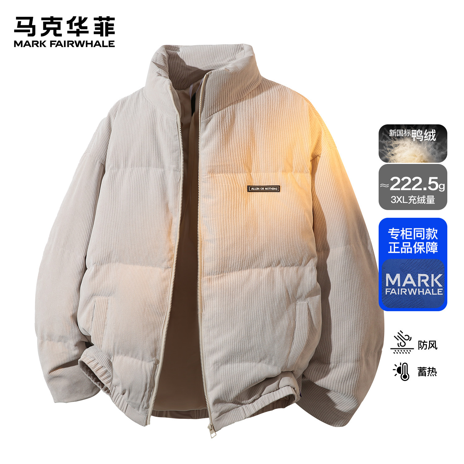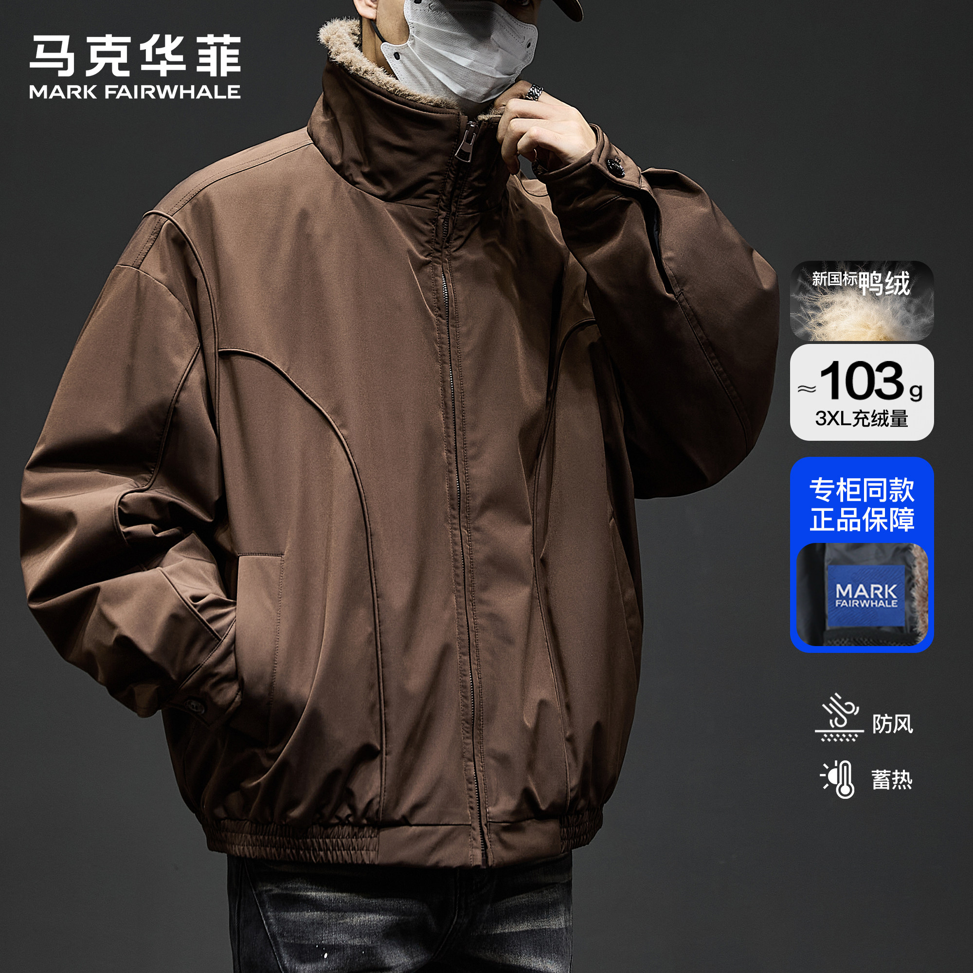 马克华菲羽绒服男春秋新款潮牌日系复古磨毛纯色保暖羊毛宽松外套