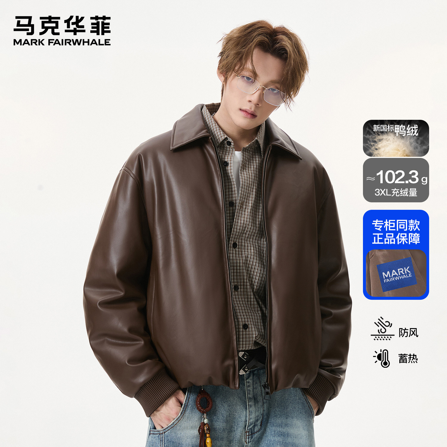 马克华菲羽绒服男款春季潮牌美式复古翻领外套保暖防寒宽松PU皮衣