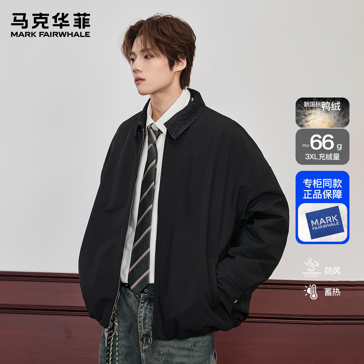 马克华菲巴恩风工装夹克羽绒服男2025秋冬季新款黑色翻领青年外套