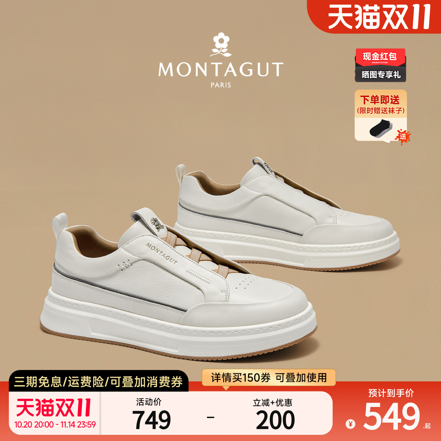梦特娇懒人一脚蹬秋冬小白鞋男士真牛皮软底舒适增高运动休闲板鞋