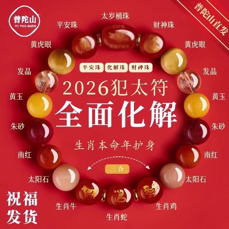 普陀山2026马本命年太岁手链护身符生肖属鼠牛兔手串水晶能量串珠