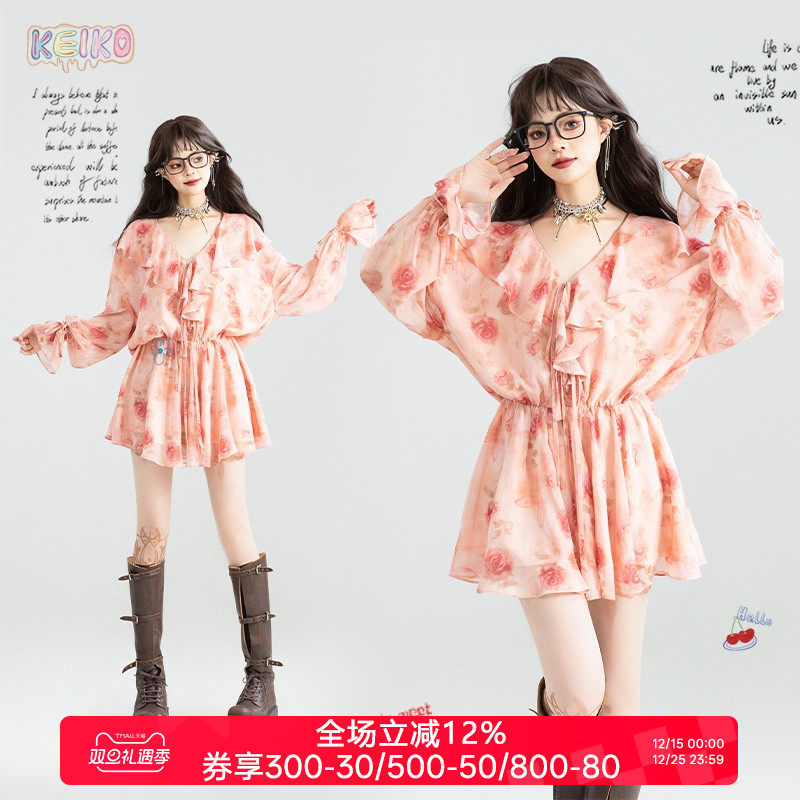 KEIKO 温柔感玫瑰纹碎花连衣裙26春季气质粉色V领收腰仙女雪纺裙