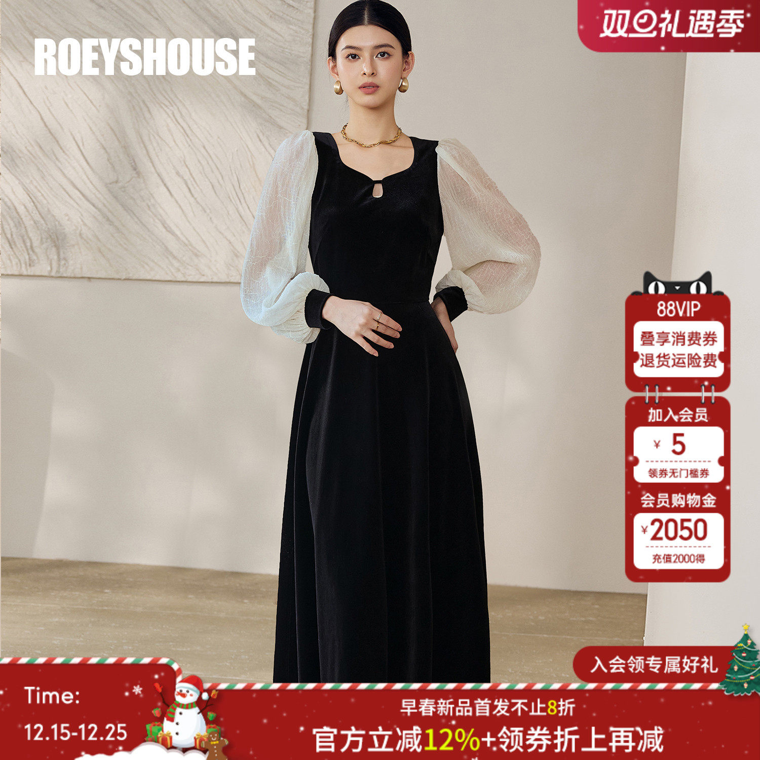 罗衣法式丝绒拼接雪纺连衣裙女春季商务灯笼袖黑色大摆裙子11571