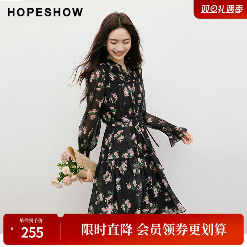 红袖春季2025新款女装玫瑰印花泡泡长袖木耳边系带V领雪纺连衣裙