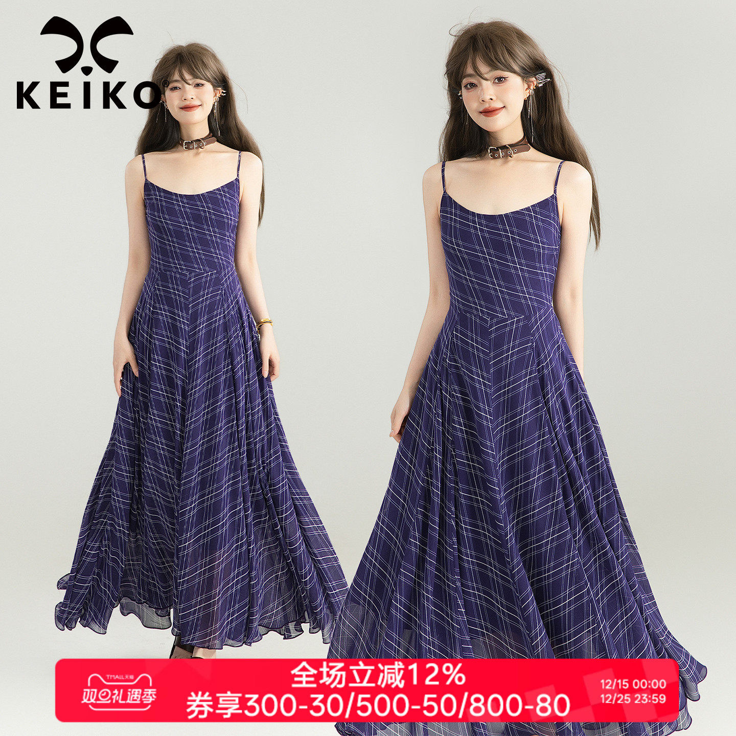 KEIKO 复古紫色格纹吊带连衣裙26春季名媛风情万种大摆雪纺长裙子