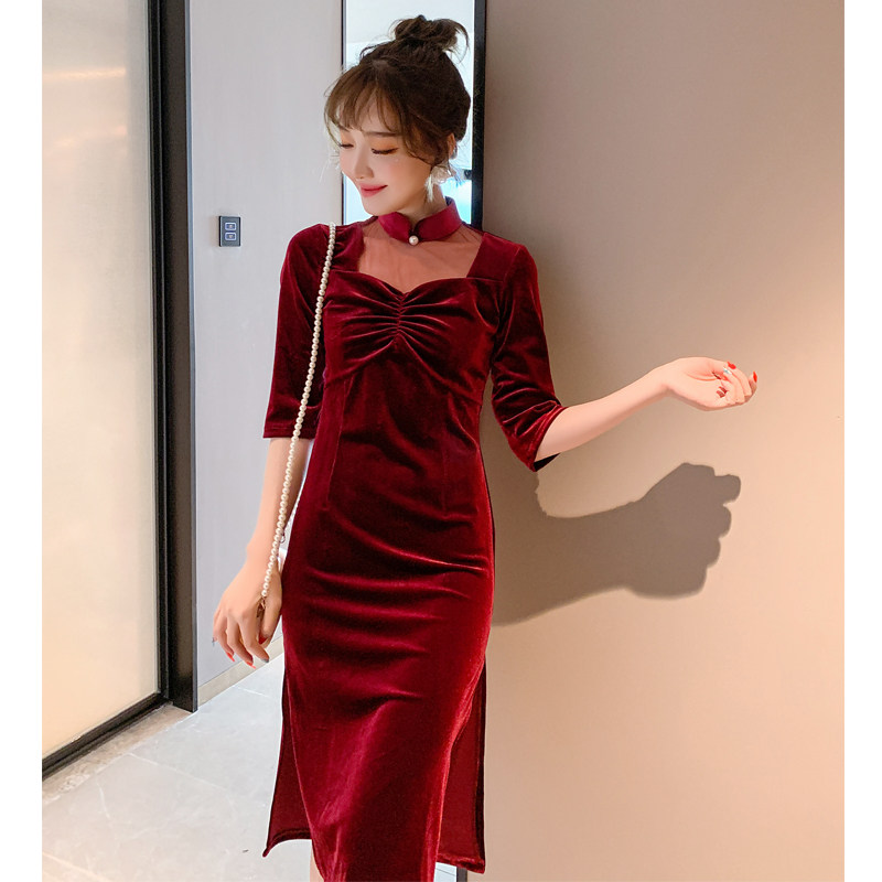 复古宫廷风旗袍连衣裙女2025新款春季开衩雪纺宴会礼服名媛旗袍裙