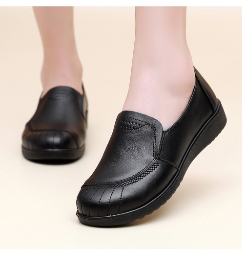 牛筋底妈妈鞋春秋平跟浅口休闲单鞋女复古真皮软底防滑中老年皮鞋