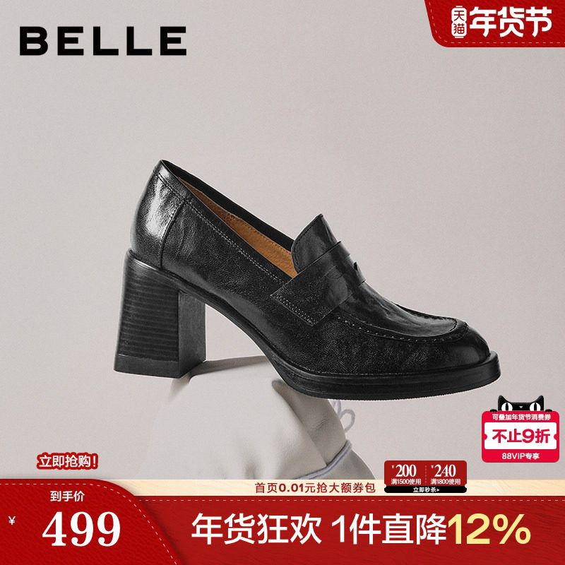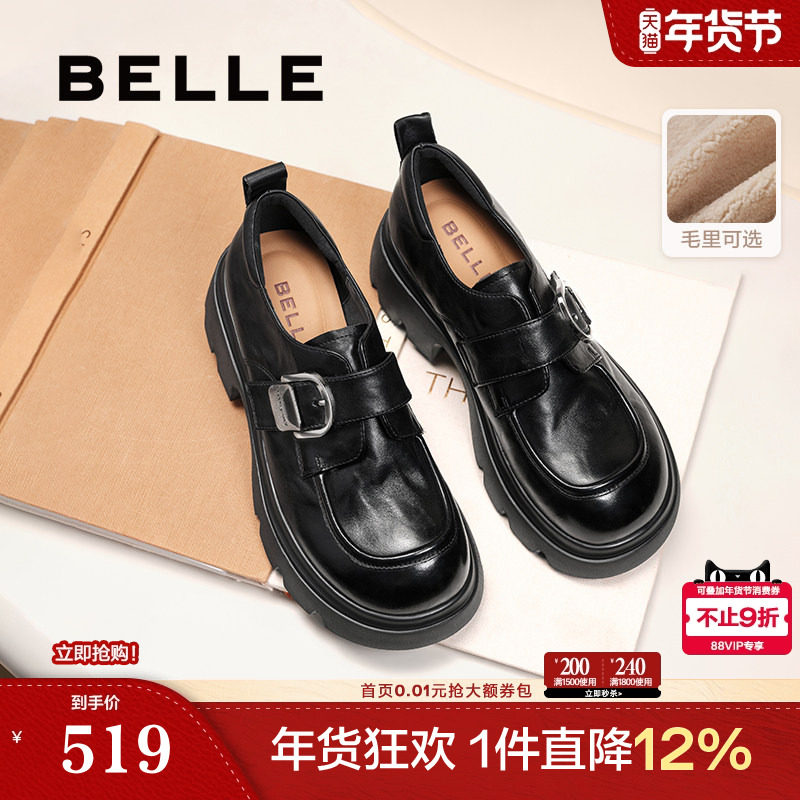 百丽元宝乐福鞋女2026春新款复古羊皮黑色小皮鞋深口单鞋E9L1DA预