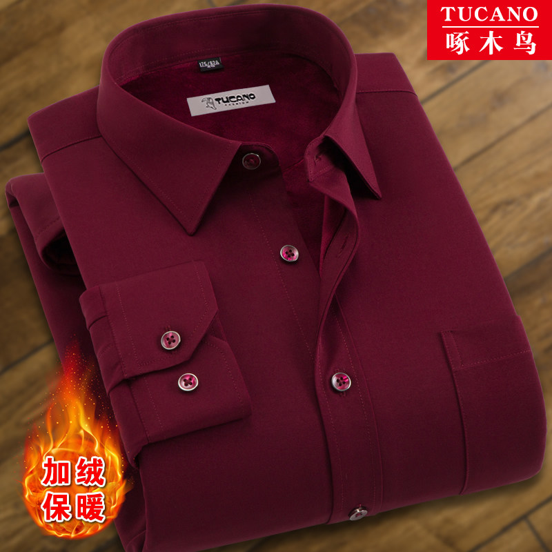 啄木鸟保暖衬衫男加绒加厚冬季商务正装免烫宽松本命年酒红色衬衣