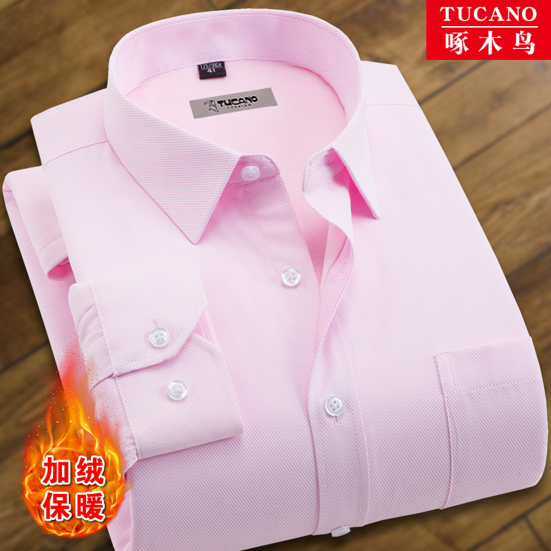 啄木鸟粉红色保暖衬衫男加绒加厚商务正装免烫宽松冬季厚款棉衬衣